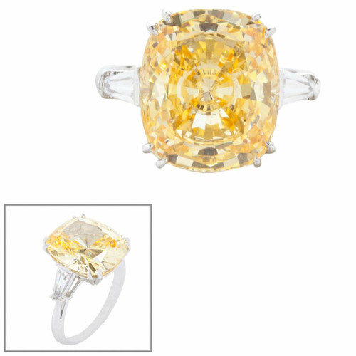 A real stunner! This 8-carat soft and buttery canary, cushion-cut center stone is full of glittering personality. Flanked by matching 0.25 carat dazzling, baguette side stones and set in a 14K gold or gold vermeil setting for luxurious durability and glamor.