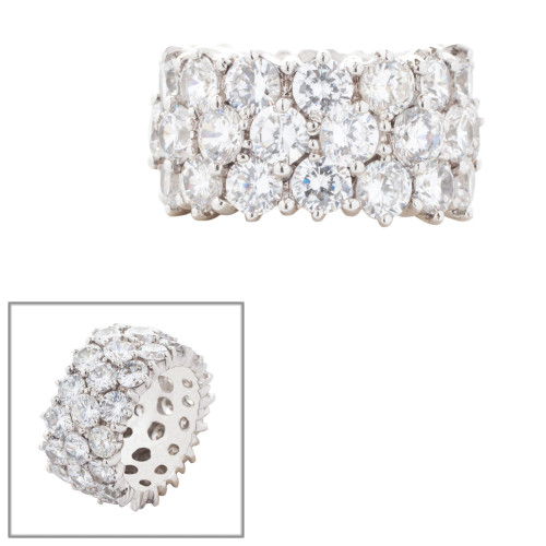 A bold eternity band, perfect for anyone who loves a good ring stack! This impressive eternity band features three rows of 0.1-carat (3mm), flawless, hand-set, brilliant-round simulated diamond stones and gives a scintillating dose of sparkle balanced with impressive finger coverage. Masterfully finished in a 14K gold or gold vermeil setting and designed with luxury and quality in mind.